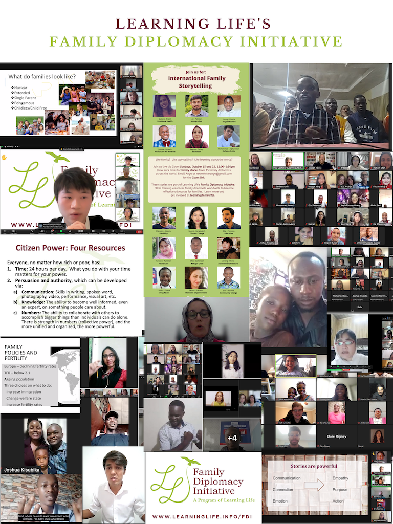 In 2022, Learning Life began FDI Phase 2 (see the Family Diplomacy Vision poster at the bottom of the FDI page for Phase details), successfully launching our first family diplomat (FD) training. Occurring weekly on Sundays via Zoom from June to October 2022, the training had two parts. The first part developed trainees’ basic knowledge about citizen diplomacy, plus global family trends, patterns and issues. The second part had participants learning about then practicing family storytelling given storytelling’s importance to giving voice and power to ordinary people worldwide facing myriad family issues.
