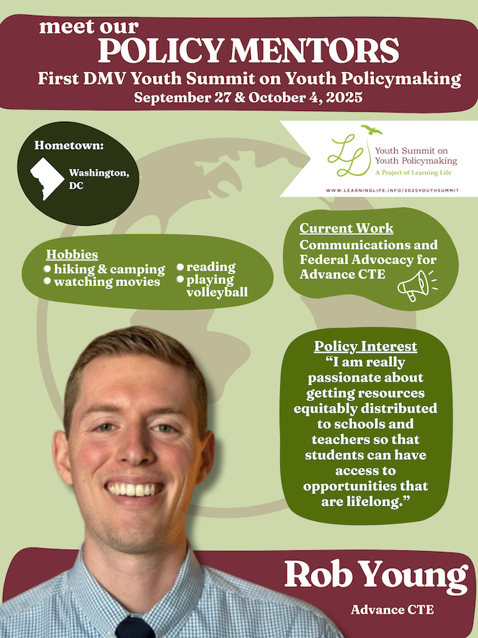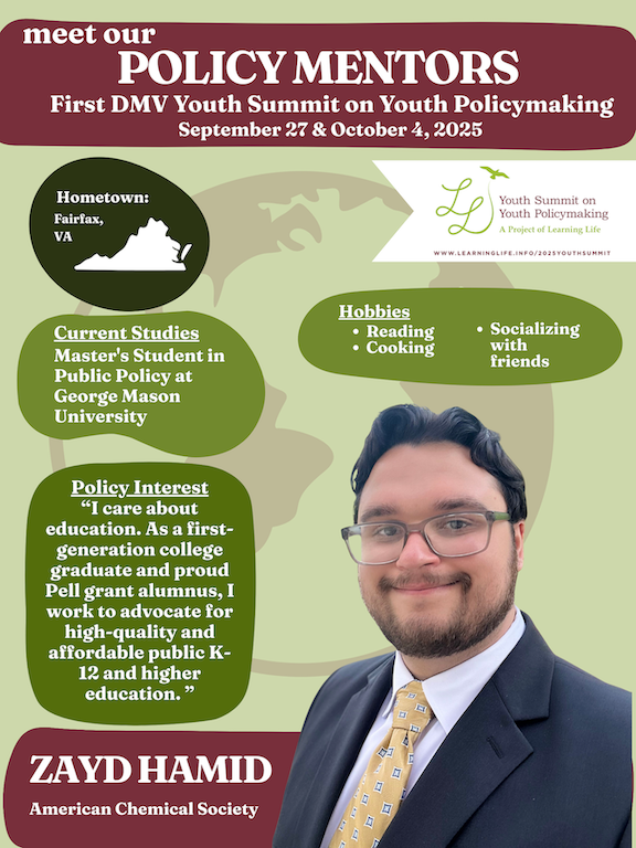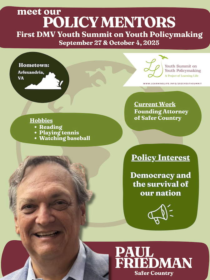 Then volunteer to be a Policy Mentor!  Learning Life, a Washington DC-based nonprofit working to widen participation in democracy and diplomacy, seeks junior and senior policy mentors to mentor up to 120 8th-12th graders from diverse DMV private, public and charter schools as they go through the Summit policymaking process.
